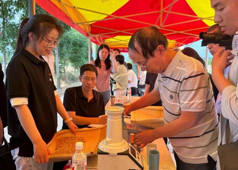 測產(chǎn)專家組按照《全國糧食高產(chǎn)創(chuàng)建測產(chǎn)驗收辦法(試行)》,進行清倉、丈量田塊、過磅稱重、測定籽粒含水率、去雜等程序,收獲面積11.78畝,鮮重8560公斤,籽粒平均含水率17.32%,折算成13%標準含水率凈重8134.95公斤,折合畝產(chǎn)690.57公斤。