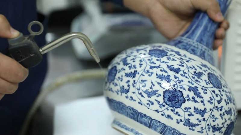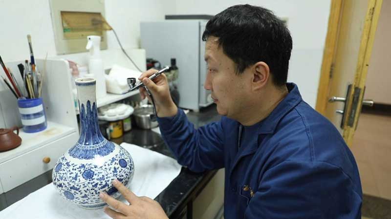 陶瓷修復(fù)是個“細活”,從前期的現(xiàn)狀調(diào)查、方案制定、檢測分析、技術(shù)路線篩選,到后期的清洗、粘補、打磨、作色、補繪、仿釉等,步驟繁多,對技術(shù)和耐心都是極大的考驗。