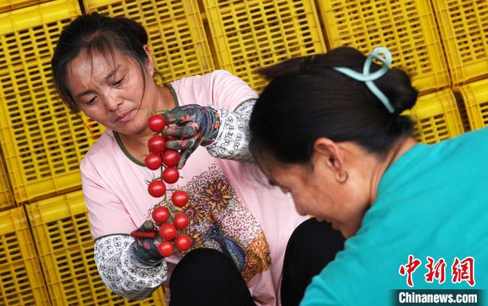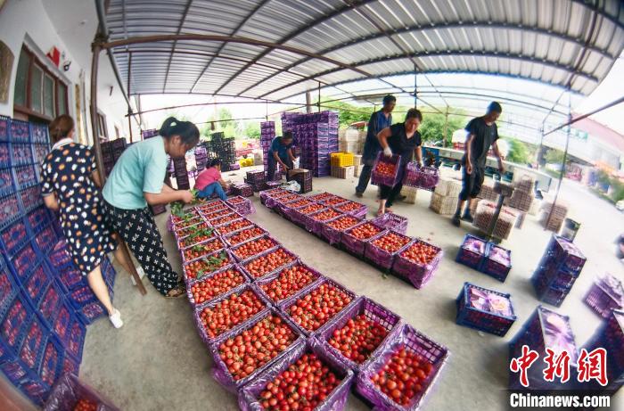 6月18日,夏至將至,山西省設(shè)施蔬菜大縣運(yùn)城市新絳縣,西紅柿、黃瓜等30多個品種10萬畝設(shè)施蔬菜進(jìn)入產(chǎn)銷旺季。圖為菜農(nóng)在泉掌鎮(zhèn)王守莊村蔬菜批發(fā)市場修剪裝箱圣女果。 高新生 攝