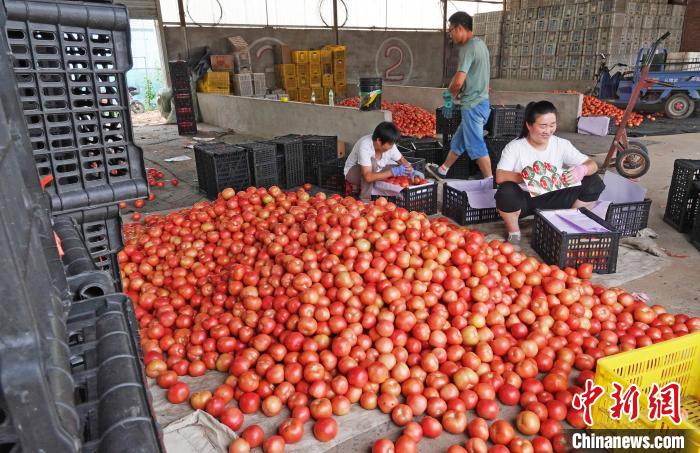6月18日,山西省運(yùn)城市新絳縣泉掌鎮(zhèn)王守莊村蔬菜批發(fā)市場,菜農(nóng)冒著高溫天氣為客商裝箱西紅柿。 高新生 攝