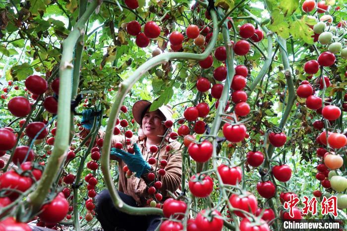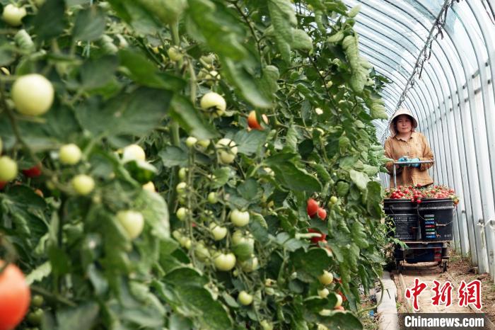 6月18日,夏至將至,山西省設(shè)施蔬菜大縣運(yùn)城市新絳縣,西紅柿、黃瓜等30多個品種10萬畝設(shè)施蔬菜進(jìn)入產(chǎn)銷旺季。圖為三泉鎮(zhèn)席村菜農(nóng)韓春燕冒著高溫天氣搶收圣女果?!「咝律?攝