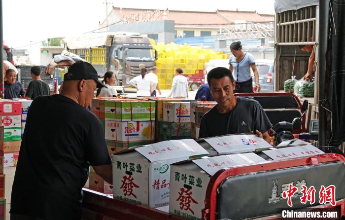 6月18日,夏至將至,山西省設(shè)施蔬菜大縣運(yùn)城市新絳縣,西紅柿、黃瓜等30多個品種10萬畝設(shè)施蔬菜進(jìn)入產(chǎn)銷旺季。圖為菜農(nóng)在泉掌鎮(zhèn)南張村蔬菜批發(fā)市場為客商裝車蔬菜。 高新生 攝