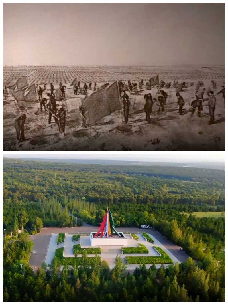 ??上圖為上個世紀右玉人植樹造林的場景;下圖為右玉植樹造林后的綠色景象。新華社發(fā)