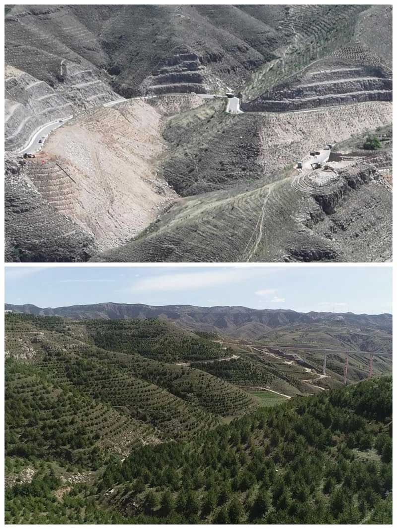 ??上圖為偏關縣植樹造林前大面積的荒坡;下圖為偏關縣植樹造林后的景象。新華社發(fā)