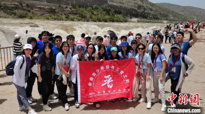 圖為華裔青少年在壺口瀑布合影留念。任國(guó)英 攝