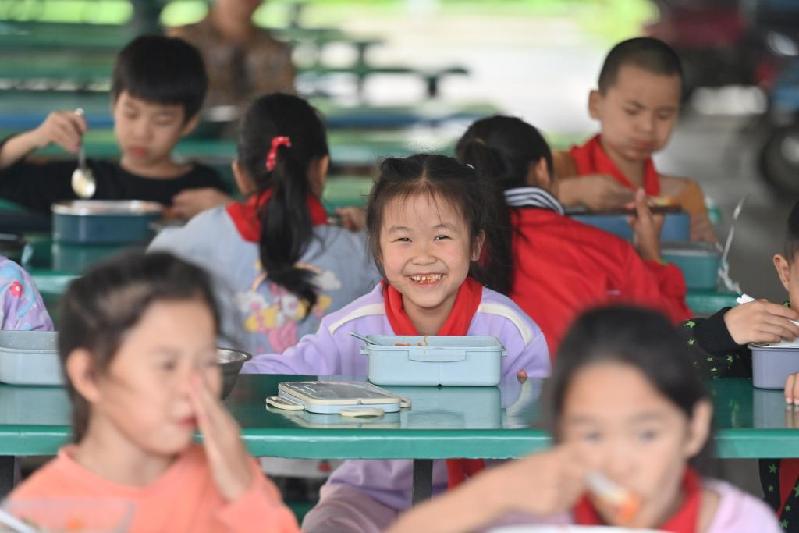 ??5月31日,廣西柳州市柳江區(qū)三都鎮(zhèn)覺山教學(xué)點(diǎn),學(xué)生們?cè)诔誀I養(yǎng)午餐。