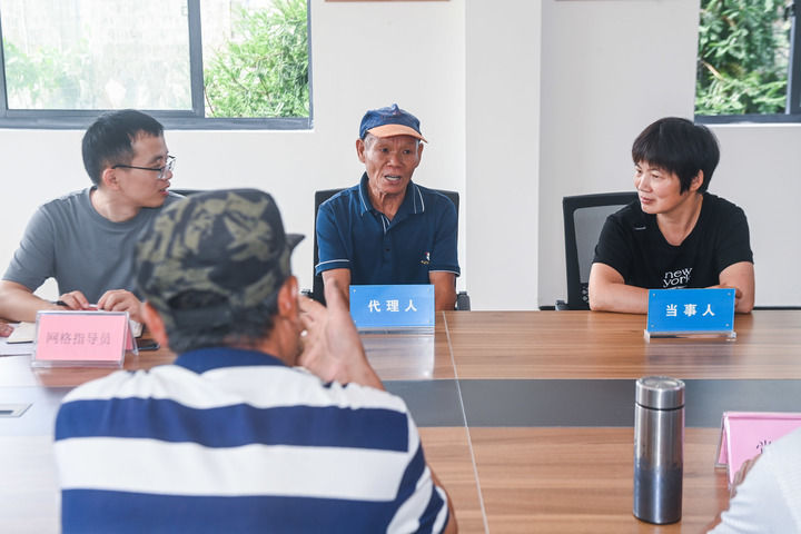 2023年7月26日,在浙江省諸暨市東白湖鎮(zhèn)婁東村新時(shí)代文明實(shí)踐站的文明共富會(huì)客廳內(nèi),網(wǎng)格長召集村里矛盾雙方當(dāng)事人以及黨員代表、鄉(xiāng)賢代表、人大代表等成員進(jìn)行宅基地指標(biāo)糾紛的現(xiàn)場調(diào)解。新華社記者 徐昱 攝