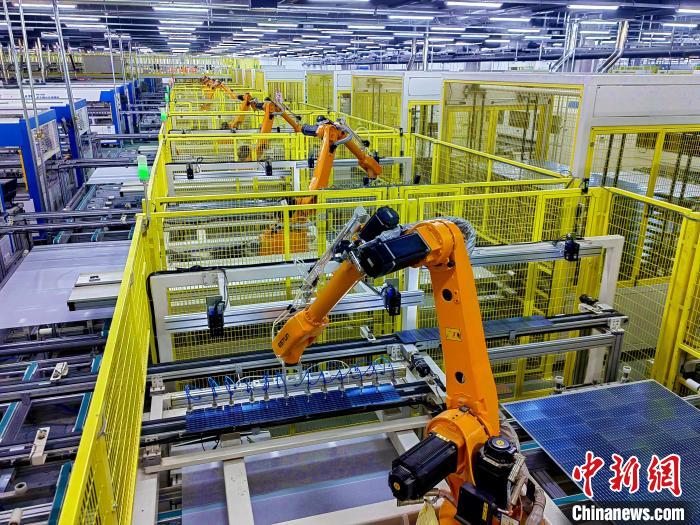 產(chǎn)品制造車間,機(jī)械臂靈活揮舞,經(jīng)過激光劃片、焊接、排版、質(zhì)檢等,一片片晶硅光伏組件順利下線,一系列專業(yè)性要求極高的工種全部實(shí)現(xiàn)自動(dòng)化。車間組長(zhǎng)馮云介紹,數(shù)智賦能不僅焊接質(zhì)量好,P型、N型良品率還分別達(dá)到99.7%、99.2%以上。