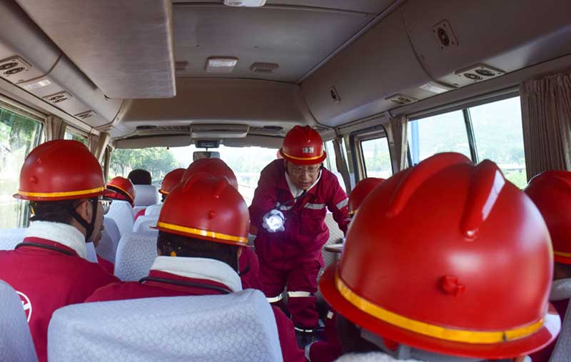 ??8月1日,華陽(yáng)二礦相關(guān)負(fù)責(zé)人在前往礦井的交通巴士上向下井人員介紹頭燈裝備的使用。新華社發(fā)(李學(xué)斐 攝)