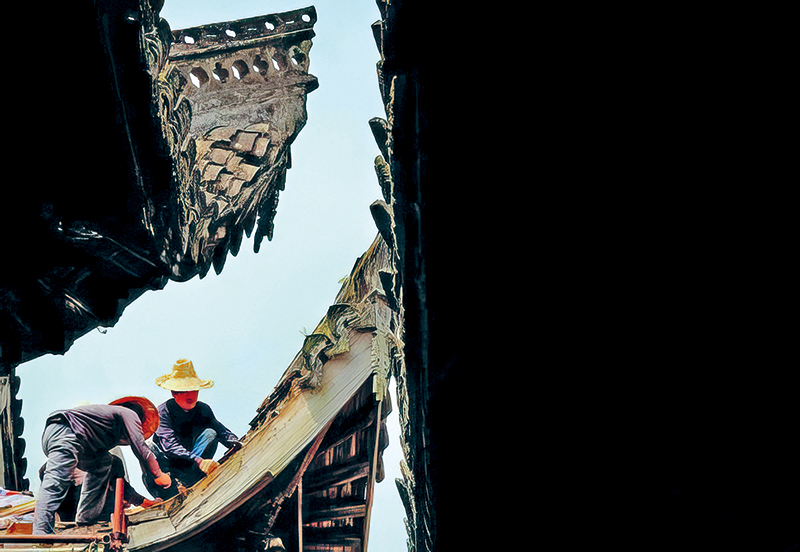 榆社古建技藝歷史悠久,素有“古建之鄉(xiāng)”的美稱。經(jīng)過40多年的逐步發(fā)展,現(xiàn)有彩繪、壁畫、雕塑、造像四大門類,形成集人才培養(yǎng)、規(guī)劃設(shè)計(jì)、施工管理、材料生產(chǎn)、文創(chuàng)開發(fā)于一體的古建全產(chǎn)業(yè)鏈,從業(yè)人員達(dá)到1.5萬人,產(chǎn)值突破20億元。圖為8月10日,榆社古建工程隊(duì)在施工現(xiàn)場(chǎng)修復(fù)古建筑。