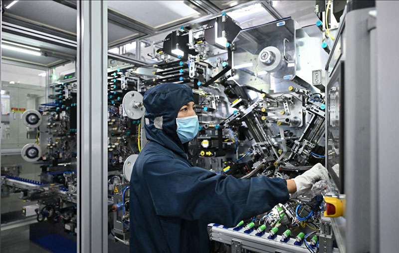??7月31日,華陽新材料科技集團華鈉芯能科技有限責任公司的工作人員在圓柱電芯制片卷繞機上操控設(shè)備運行。新華社記者 李鑫 攝
