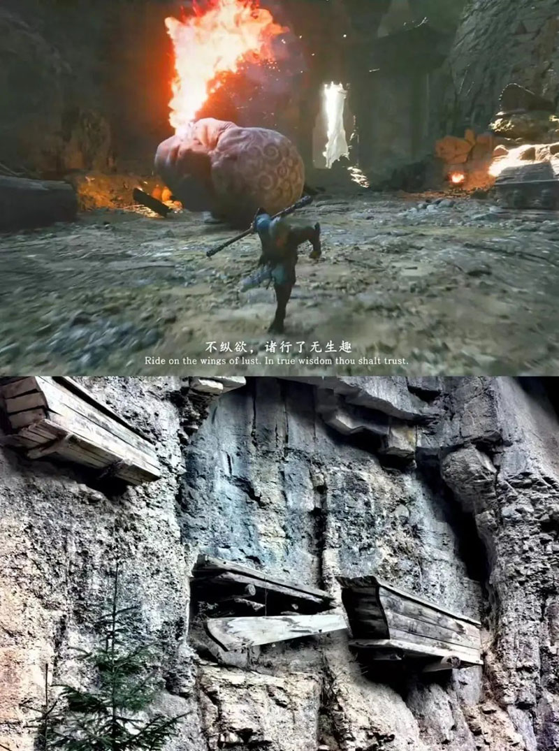 △上為游戲場(chǎng)景,下為寧武石門懸棺。