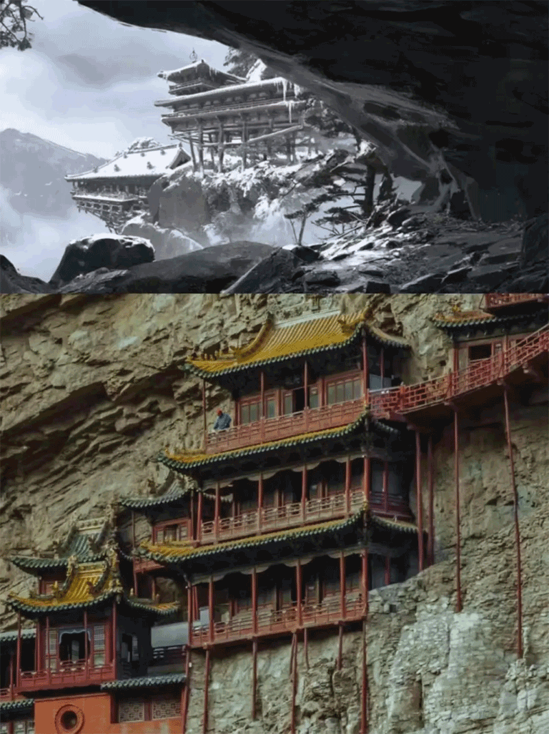 △上為游戲場(chǎng)景,下為大同懸空寺。