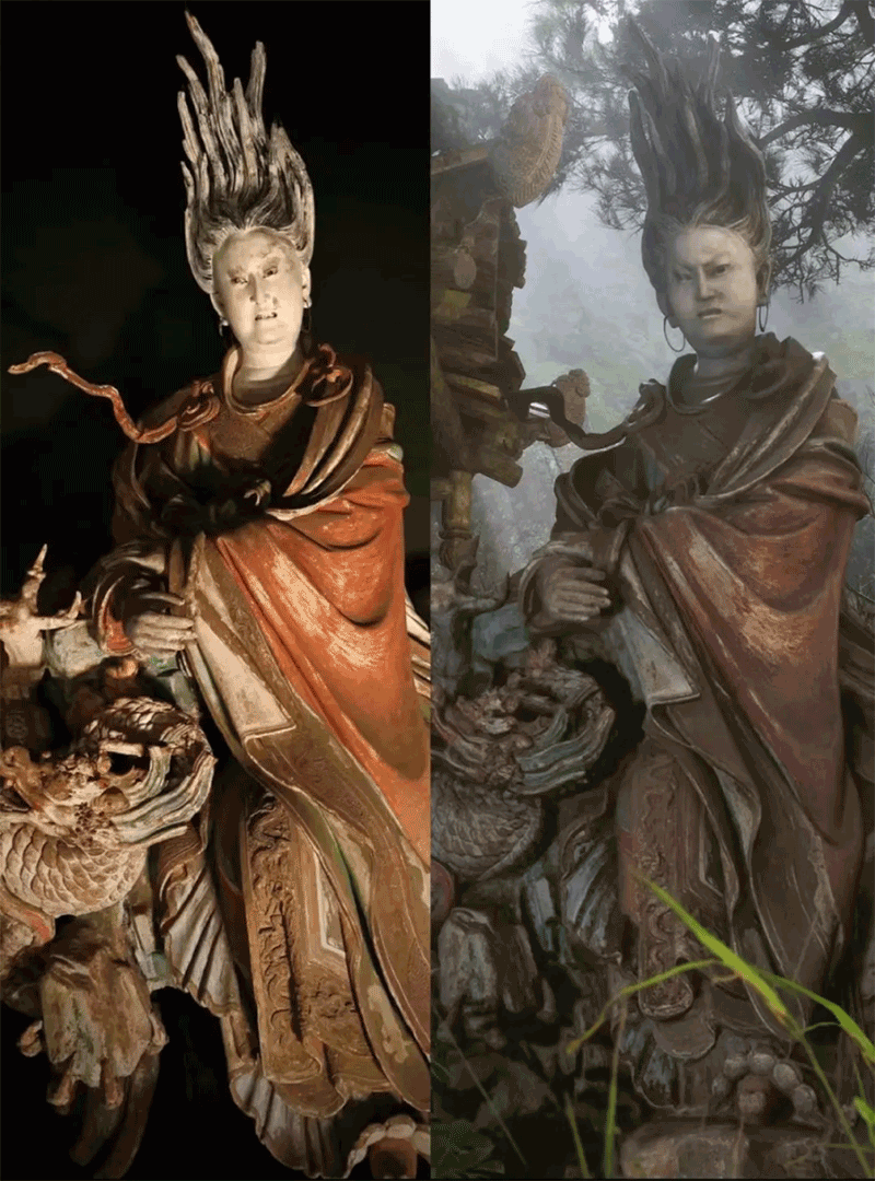 △左為晉城玉皇廟的二十八星宿塑像之一“亢金龍”,右為游戲場(chǎng)景。