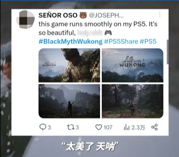 △外國(guó)玩家對(duì)《黑神話:悟空》游戲畫面表示驚嘆。