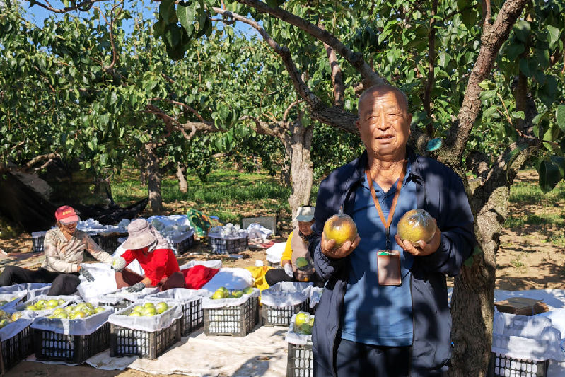 今年78歲的閆云海從20世紀(jì)80年代開始種梨,蜜梨、酥梨等品種試了個(gè)遍,最后找到梨果專家引進(jìn)了玉露香梨。“玉露香梨水分大、糖多、色美、皮薄、口感好,而且耐保存。如今我們家三代人都在種玉露香梨?!遍Z云海說。