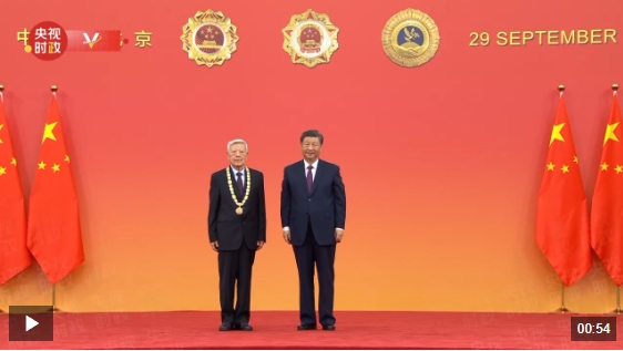 中華人民共和國國家勛章和國家榮譽稱號頒授儀式9月29日上午10時在人民大會堂隆重舉行。中共中央總書記、國家主席、中央軍委主席習近平向“人民科學(xué)家”國家榮譽稱號獲得者趙忠賢頒授獎?wù)隆?/p>