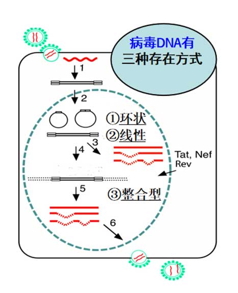 HIV-1進(jìn)入人體細(xì)胞以后,病毒RNA逆轉(zhuǎn)錄成cDNA,這種雙鏈DNA作為整合前體(pre-integration complex, PIC)的組成部分穿過細(xì)胞核并整合到宿主的基因組中。整合的病毒基因被轉(zhuǎn)錄,繼而合成病毒蛋白,完成病毒復(fù)制周期。然而,在感染的細(xì)胞中,除了整合的DNA外,還有多種形式的未整合的cDNA。