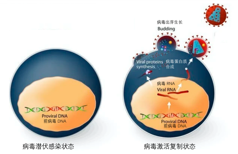 圖2. HIV的潛伏感染(左)和激活感染(右)