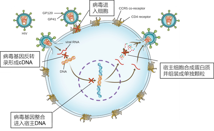 這就是HIV的復制之旅,一次次重復,不停地傷害著人體的免疫系統(tǒng)。為對抗它,我們需要開始服用抗病毒藥物,這些藥物通過阻斷這個復制周期中一個個靶點(圖中所示的一個個紅叉),從而抑制病毒的復制,保護感染者的身體。