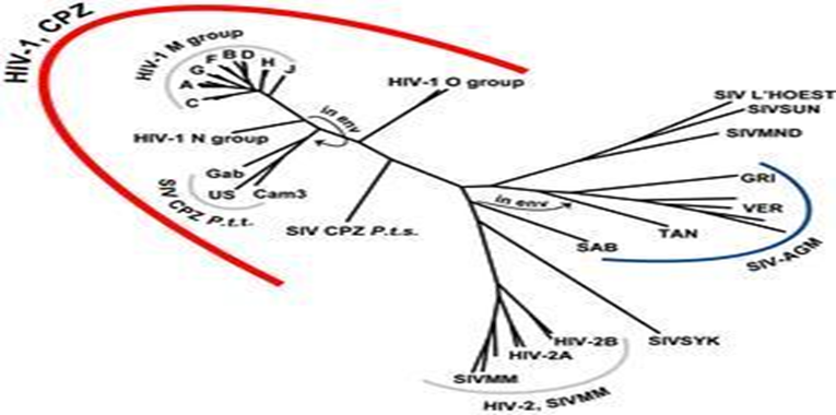 HIV-1和黑猩猩免疫缺陷病毒(SIVcpz)的基因組成十分接近,很可能是SIVcpz經(jīng)跨物種傳播給人類的[2]。而HIV-2的基因組與烏白眉猴免疫缺陷病毒(SIVsm)十分接近,HIV-2很可能來源于此[3]。HIV-1和HIV-2氨基酸水平的同源性僅為40%-60%[4]。