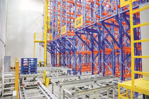 走進全自動立體倉庫,庫內(nèi)采用堆垛機+RGV機器人,實現(xiàn)了人不入倉的自動化管理。貨物分品類進入冷庫,4臺堆垛機自動識別輸送,偌大的冷庫十幾米鋼體貨架,上下貫通,整齊擺放,蔚為壯觀。在庫內(nèi)穿堂區(qū)域,乳制品、速凍食品等食材分門別類,整齊擺放,幾輛叉車來回作業(yè),貨車頻繁進出,忙碌而有序。