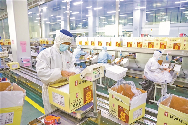 在嶄新的廠房內(nèi),現(xiàn)代化、標(biāo)準(zhǔn)化的自動生產(chǎn)線有 10 余條,還配套了最新的檢驗檢測中心,產(chǎn)品定位為中高端粗糧、雜糧、功能性餅干、糕點和膨化食品,滿足消費者多樣化的健康消費需求。穿戴好工作服進入干凈明亮的車間,只見兩條生產(chǎn)線上剛出爐的缸爐餅熱氣騰騰、香氣四溢,從最初的和面、成型,到烘焙、包裝,各個環(huán)節(jié)秩序井然、有條不紊地進行著。