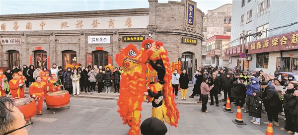 1月21日,太谷古城南大街熱鬧非凡,文藝工作者們踏著歡快的鼓點(diǎn)表演舞獅、秧歌、形意拳等民間社火節(jié)目。當(dāng)日,太谷古城年貨節(jié)、古城社火節(jié)正式拉開(kāi)序幕,上千種琳瑯滿(mǎn)目的年貨和豐富多彩的民間社火讓古城的年味愈加濃重。