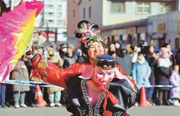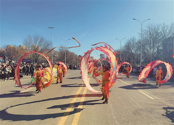 次日上午,巡演活動(dòng)繼續(xù)升溫。來(lái)自張慶鄉(xiāng)、錦綸街道和安寧街道的3支代表隊(duì),以舞龍、舞獅、劃旱船、騎毛驢、高蹺、背棍、鐵棍等民俗表演,為觀眾帶來(lái)一場(chǎng)視覺(jué)盛宴,引得觀眾陣陣喝彩。整條街道匯成了歡樂(lè)的海洋,濃郁的年味流淌在城市的大街小巷,定格了每個(gè)人對(duì)年的美好記憶。圖為新春社火巡演現(xiàn)場(chǎng)。