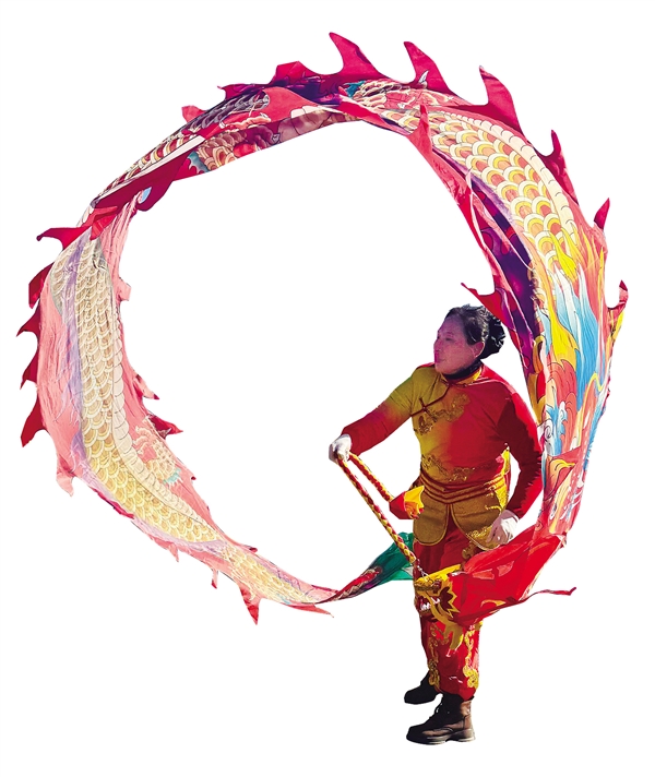 隨后的舞龍表演更是將現(xiàn)場氣氛推向了高潮。只見18人組成的舞龍隊伍在激昂的鼓點中穿梭起舞,龍頭高昂,龍身蜿蜒盤旋,表演歡快喜慶、扣人心弦。市民田瑞帶著家人來看社火表演:“今天可真熱鬧,這讓我想起了小時候看社火的情景。孩子還沒有這樣近距離觀看過社火表演,今天帶他來,就是想讓他感受一下咱們晉中傳統(tǒng)社火的魅力?!?/p>