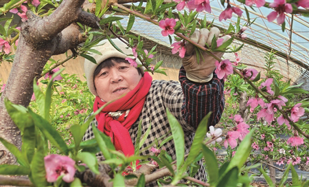 2月9日,太谷巨鑫現(xiàn)代農(nóng)業(yè)示范區(qū)設(shè)施蔬菜大棚,油桃花盛開,大棚管理員龐鳳清正在為油桃人工授粉。隨著氣溫的回升,該園區(qū)大棚油桃進(jìn)入盛花期,預(yù)計5月上旬第一茬油桃即可上市。