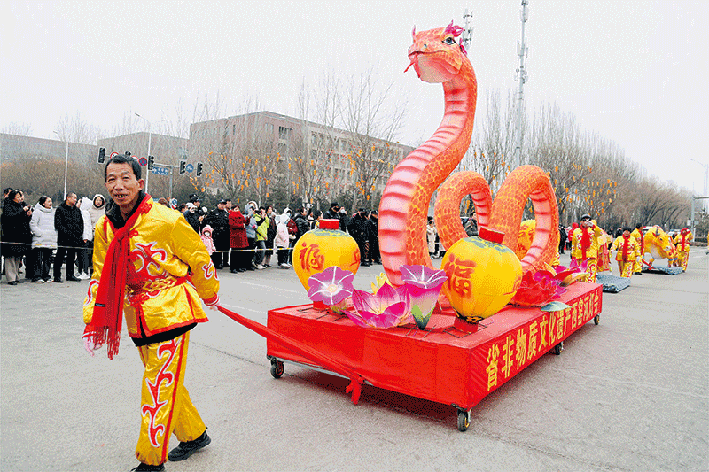 2月8日(農(nóng)歷正月十一)、9日(農(nóng)歷正月十二),“靈蛇迎瑞氣 活力鬧新春”新春社火巡演、“蛇舞飛揚(yáng) 魅力綻放”新春社火巡演分別在市城區(qū)文苑街上演。榆次區(qū)郭家堡鄉(xiāng)、晉華街道、經(jīng)緯街道的3支社火隊,共計千余人,帶著新春的祝福隆重登場。舞龍、舞獅、秧歌、腰鼓等20個節(jié)目依次上演。演員們身著盛裝,精神抖擻,踏著鼓點(diǎn)盡情演繹;2月9日,來自榆次區(qū)張慶鄉(xiāng)、錦綸街道、安寧街道的社火隊伍先后登場。城西鐵棍、扭秧歌與旱船表演等趣味十足,自編節(jié)目《夸土產(chǎn)》,以表演唱形式生動介紹榆次美食,贏得陣陣掌聲,將長長的街道變成了歡樂的海洋。