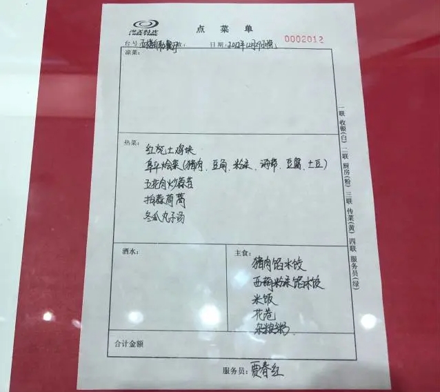 一張菜單,內(nèi)容是標(biāo)準(zhǔn)的“四菜一湯”:紅燒土雞塊、阜平燴菜、五花肉炒蒜薹、拍蒜茼蒿、冬瓜丸子湯。主食也很簡單。落款日期是2012年12月29日。