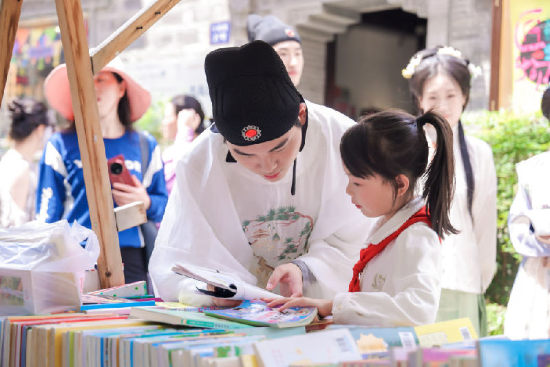 ??南京金陵舊書市集里,古風(fēng)裝扮NPC(非玩家角色)引導(dǎo)員正在與一位小學(xué)生互動。(受訪者供圖)