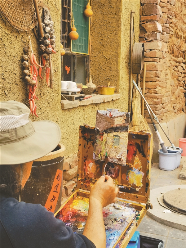 后溝民居依地勢(shì)而建,年畫鋪和微雕工坊相隔不遠(yuǎn),在村東,背靠山崖,前有河水淙淙,遠(yuǎn)處土垣上綠樹蔥郁,幽靜中別有趣味。往前走不遠(yuǎn),就是文昌閣,不時(shí)有人在安靜作畫,或油畫或水墨,或素描或水粉,勾勒著古村晨昏,渲染著后溝風(fēng)韻。