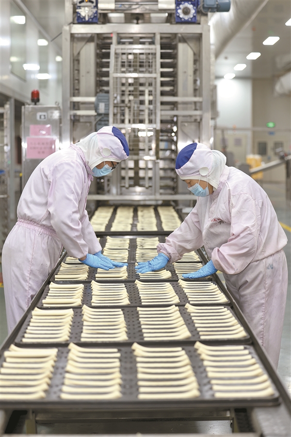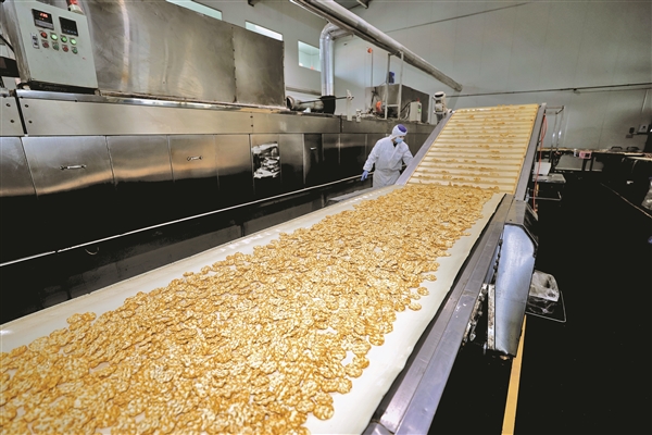 5月11日,山西海玉園食品有限公司石頭餅生產(chǎn)車(chē)間,全自動(dòng)的現(xiàn)代化生產(chǎn)設(shè)備串聯(lián)出一條“行云流水”的生產(chǎn)線:和面、成形、鋪石、烘烤……每一道工藝流程都實(shí)現(xiàn)了智能化、標(biāo)準(zhǔn)化、現(xiàn)代化。