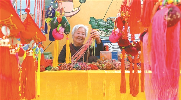 5月29日,太谷區(qū)侯城鄉(xiāng)西峪村“留住鄉(xiāng)愁、兒時端午”民俗文化展示活動現(xiàn)場,榆次區(qū)77歲的端午香包非遺傳人楊鳳英正為游客介紹香包的制作技藝。通訊員 孫泰雁 攝