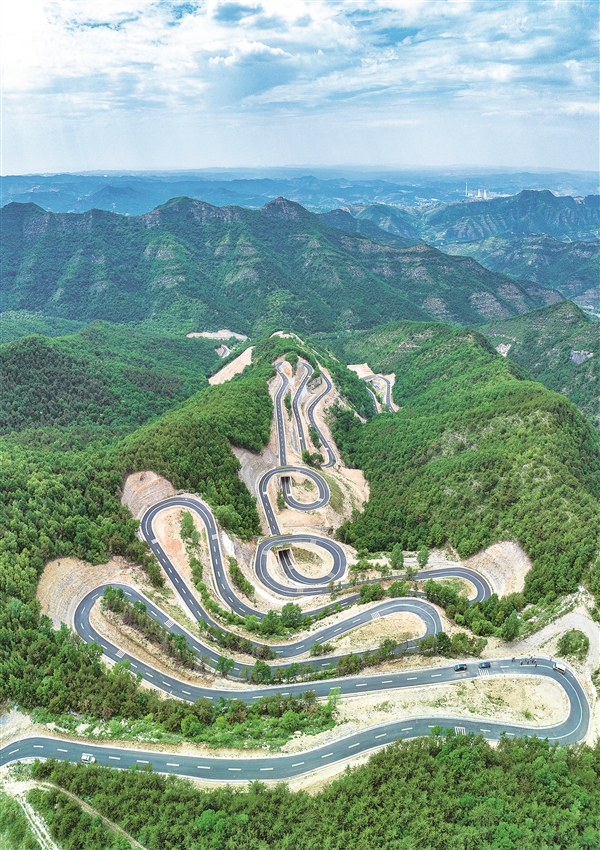 6月5日俯拍的左權(quán)縣太行一號旅游公路張家莊至北天池山段。公路蜿蜒盤旋,獨特的“72道彎”景觀壯美震撼。近年來,左權(quán)縣依托這一獨特景觀打造“公路旅游”新業(yè)態(tài),串聯(lián)起沿線文旅資源。