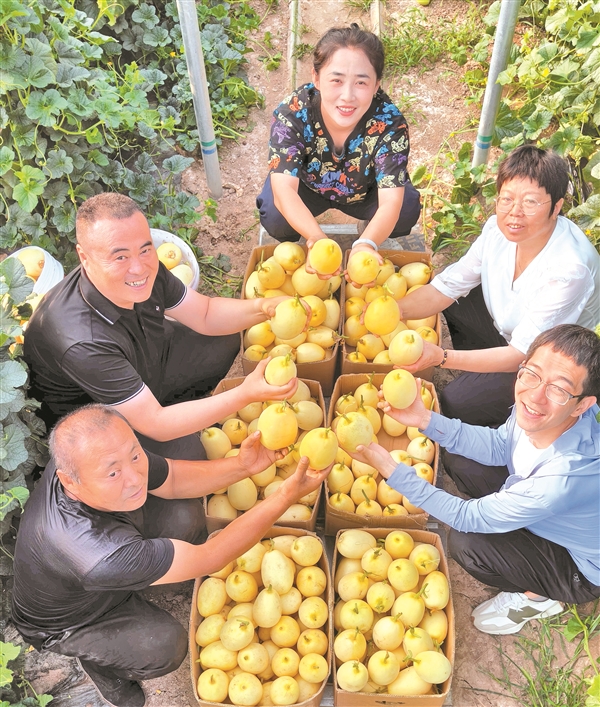 6月13日,太谷區(qū)侯城鄉(xiāng)杜家莊村香瓜產(chǎn)業(yè)園區(qū),返鄉(xiāng)創(chuàng)業(yè)大學(xué)生杜雅欣(中)正在與村黨支部書記杜文勇(左二)一起展示即將發(fā)運外地的新品種訂單香瓜。該產(chǎn)業(yè)園區(qū)著力打造“小杜香瓜”村域品牌,通過線上+線下的營銷模式,以質(zhì)量興農(nóng)帶動全體村民增收致富。