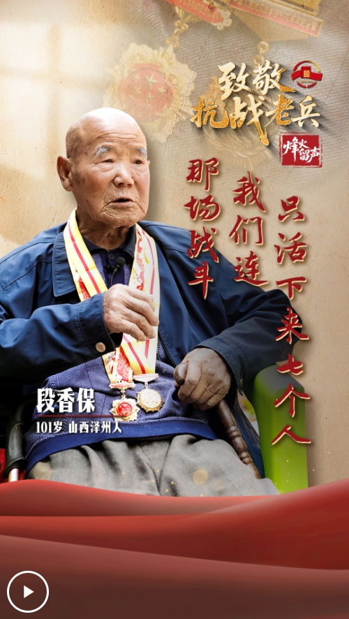 段香保,101歲,山西晉城澤州縣巴公鎮(zhèn)郭家莊人。15歲入伍,在長治、呂梁、臨汾、運(yùn)城等地與日本侵略者展開游擊戰(zhàn)。曾在晉南一地掩護(hù)群眾收麥時(shí)遭遇敵人襲擊,被子彈擊穿右側(cè)小腿。