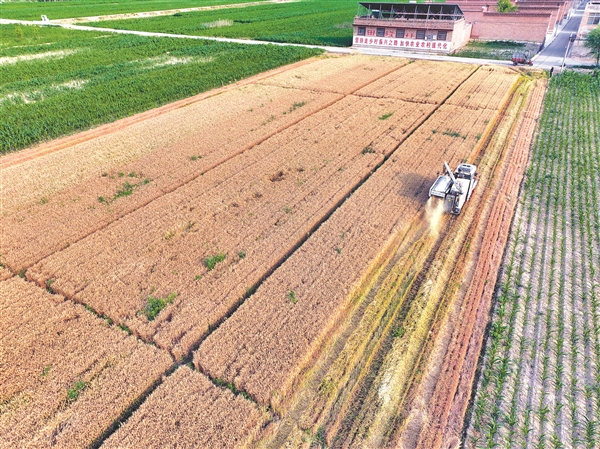 6月18日,農機手在平遙縣寧固鎮(zhèn)曹家堡村田隆祥有機小麥基地收割小麥。平遙縣夏收已全面展開,聯合收割機與秸稈還田機來往穿梭于麥田中,不僅確保小麥應收盡收,且將麥秸粉碎,為回茬復種打好基礎。