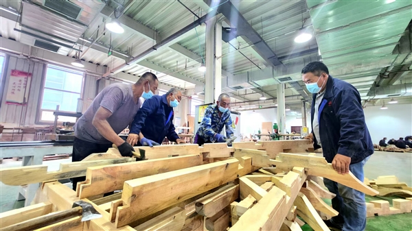 7月4日,榆社縣古建產(chǎn)業(yè)園木構(gòu)件加工車間,古建匠人正制作著項(xiàng)目所需的門窗、雕刻件。