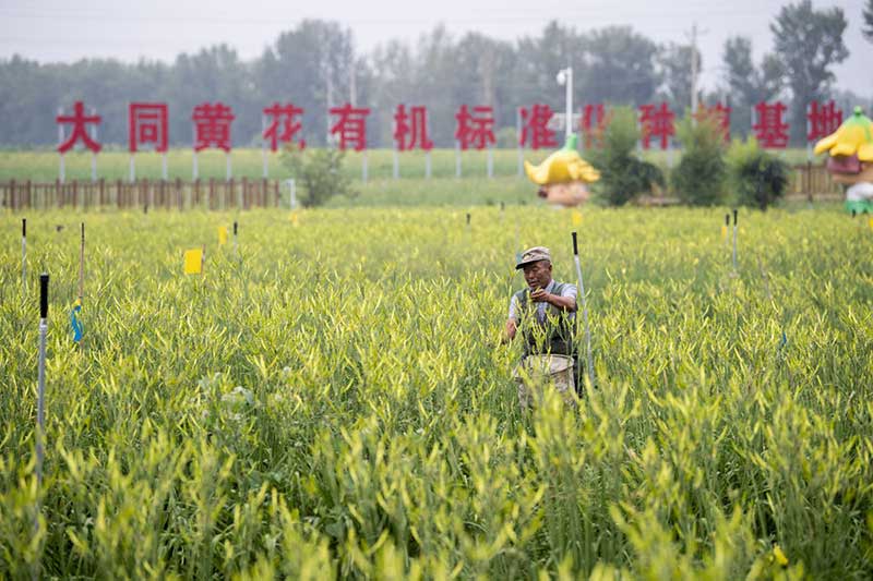 ??村民在位于云州區(qū)唐家堡村的大同黃花有機標準化種植基地內采摘黃花(2022年7月27日攝)。新華社記者 楊晨光 攝