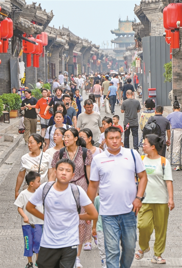 7月8日,游客在平遙古城游覽觀光。暑假以來(lái),平遙古城迎來(lái)旅游旺季,游客們游覽古城,感悟歷史文化,品味當(dāng)?shù)孛朗?,穿古裝打卡留念,樂享暑假快樂時(shí)光。