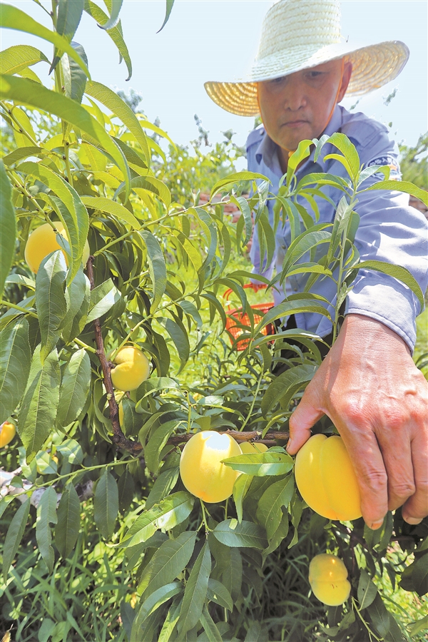 7月26日,昔陽縣東冶頭鎮(zhèn)雀鳴村村民在黃桃園內(nèi)喜摘開園果。該村地處太行山區(qū)的崇山峻嶺間,大部分地塊都符合黃桃生長所需的光照充足和土質(zhì)疏松等要求,村民種植黃桃多年,種植面積已有100余畝,現(xiàn)都已進(jìn)入盛果期。其果品具有甜度高、果肉細(xì)膩等特點(diǎn),頗受多家大型水果深加工企業(yè)青睞。眼下正進(jìn)入黃桃成熟期,村民陸續(xù)開始采收,準(zhǔn)備運(yùn)往河北、山東等地交付訂單。