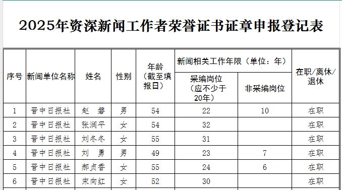 根據(jù)山西省新聞工作者協(xié)會(huì)《關(guān)于2025年資深新聞工作者榮譽(yù)證書(shū)證章申報(bào)工作的通知》要求,現(xiàn)將我社2025年符合申報(bào)條件的資深新聞工作者人員名單公示如下: