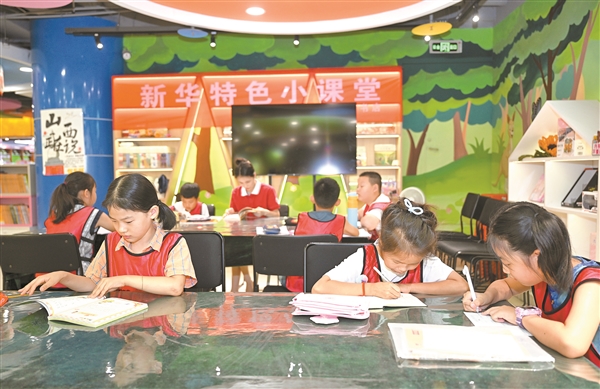 8月4日,在晉中新華書店兒童閱讀區(qū),小朋友們正在看書學(xué)習(xí)。涼爽舒適的環(huán)境和豐富充足的書籍讓這里成為青少年暑期生活的熱門選擇。