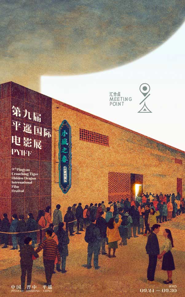 海報聚焦平遙電影宮地標“小城之春”,展現(xiàn)人流如潮的觀眾群像,呈現(xiàn)電影藝術(shù)開放包容、消融隔閡、締結(jié)人與人之間真摯連接的力量。海報中的觀眾群像取材于歷屆平遙國際電影展“小城之春”影廳前的真實觀眾影像,經(jīng)設(shè)計團隊藝術(shù)創(chuàng)作而成。右上角的影展標志,巧妙化用定位圖示,呼應(yīng)本屆電影展主題“匯合點”。