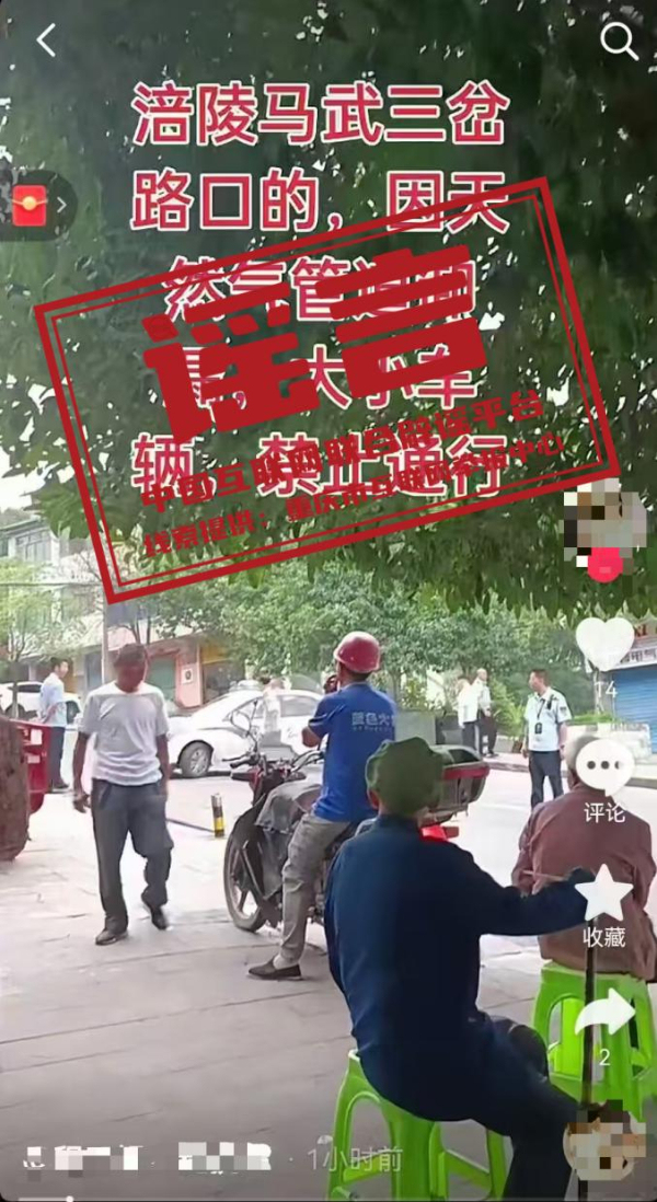 真相:近日,有網(wǎng)民在互聯(lián)網(wǎng)平臺(tái)發(fā)布信息稱“涪陵馬武三岔路口,因天然氣管道泄漏,大小車輛禁止通行”,引發(fā)關(guān)注。經(jīng)涪陵區(qū)馬武鎮(zhèn)政府核實(shí),當(dāng)日上午,天然氣公司對(duì)馬武鎮(zhèn)燃?xì)庵鞴艿肋M(jìn)行正常維護(hù),屬地相關(guān)部門和派出所對(duì)道路進(jìn)行臨時(shí)管控,并于2小時(shí)內(nèi)完成施工并恢復(fù)通車,施工過程符合操作規(guī)范,未造成人員財(cái)產(chǎn)損失,網(wǎng)傳信息系謠言。目前,屬地已對(duì)該網(wǎng)民進(jìn)行批評(píng)教育并督促其刪除不實(shí)視頻。(來源:“重慶辟謠”微信公眾號(hào))