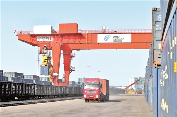 9月9日,在山西中鼎物流集團(tuán)有限公司鐵路港,工作人員正在進(jìn)行裝卸作業(yè)。目前,物流園已構(gòu)建中鼎至15個(gè)國家、40多個(gè)境外城市站點(diǎn)的國際物流網(wǎng)絡(luò),成為中部地區(qū)中歐(亞)班列貨物進(jìn)出口集散中心。